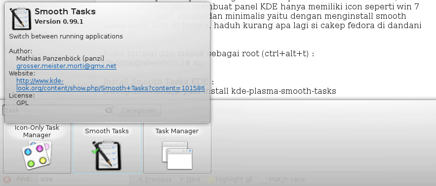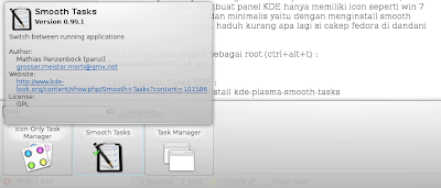 Bukan bermaksud menyamakan tampilan KDE dengan tampilan windows 7 :D kalau kenyataannya memang win 7 terinspirasi dari KDE Linux loh!, berikut ini saya akan membuat panel KDE hanya memiliki icon seperti win 7 jadi terlihat lebih simple dan minimalis yaitu dengan menginstall smooth tasks pada KDE di fedora, haduh kurang apa lagi si cakep fedora di dandani mulu :D