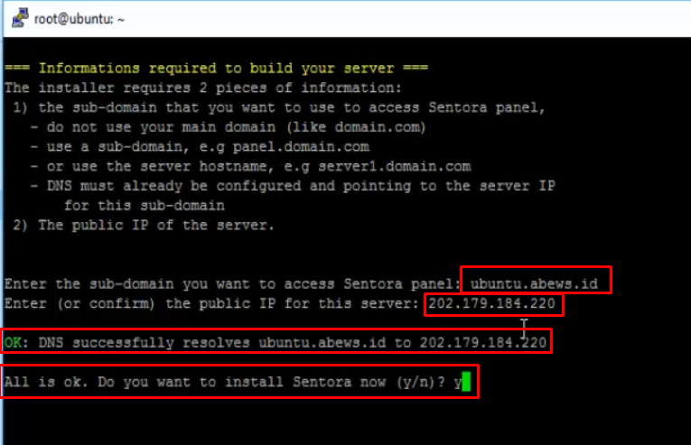 Masukan Subdomain yang akan digunakan sebagai panel login sentora, Komfrimasi IP Public anda komfrimasi dengan menjawab huruf y untuk memulai installasi.