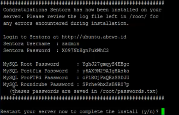 Setelah selesai installasi anda akan di berkan informasi akun untuk login pertama di sentora.